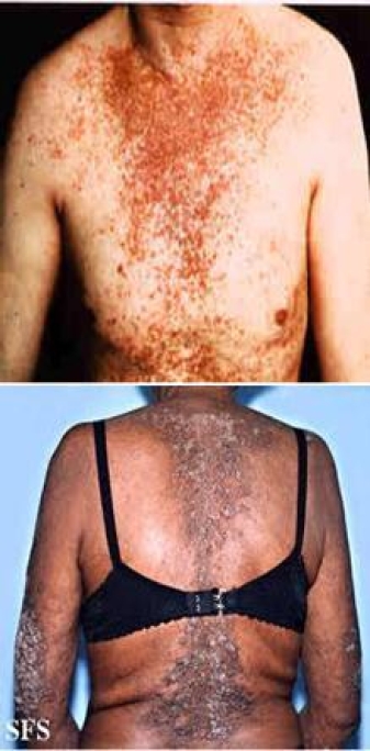 Tổn thương da là các sẩn dày sừng, trên có vảy sừng, váng dầu, màu da hoặc vàng nâu hay nâu, cứng, xù xì thô ráp “như giấy nhám”. Vị trí thường gặp là vùng da dầu (mặt: hai bên cánh mũi, trán, sau tai; cổ; ngực; lưng), vùng nếp gấp (nếp vú, rãnh liên mông…) Các sẩn nhỏ có thể tập trung thành đám, mảng lớn. Các tổn thương khác có thể gặp như dát phẳng như tàn nhang, hạt cơm gồ cao hay trứng cá bọc.